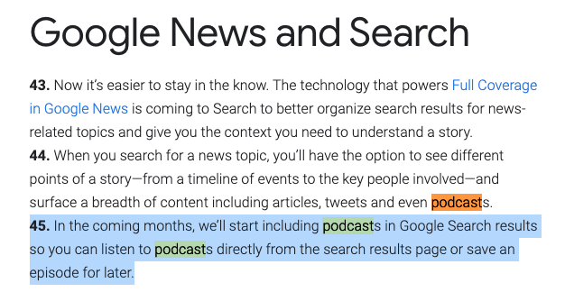 This is big news for podcasts due to the massive traffic that comes to news from search. Audio Articles could now start to compete with text articles within search.
