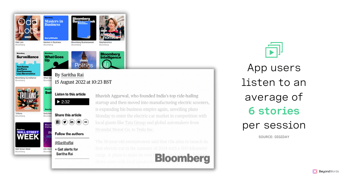 Meanwhile, publications like The Wall Street Journal and Bloomberg are using voice AI to deliver audio articles at scale on their websites and apps. Bain and Coronation are two of the financial services firms using BeyondWords text-to-speech to make their expert analysis and insights audible.