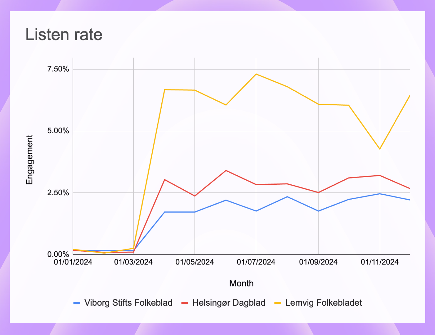 The results were immediate. Listener data from three local dailies—Lemvig Folkeblad, Helsingør Dagblad, and Viborg Stifts Folkeblad—showed dramatic gains.